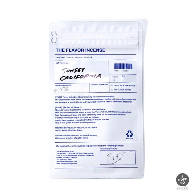 "SUNSET CALIFORNIA"はスモーキースパイシーフローラル、ソルトのとても爽やかな香りになります。 夕陽を見ながら爽やかな香りと共に素敵なひと時をお過ごしください◎ 自社FACTORYで大量生産を目的とせず、熟練の職人技で製作されたINCENSEはハンドワークに拘り続けています。 バンブーの芯は一つ一つを限界の細さに裂き、火で燻したスティック。絶妙な圧縮で煙の量を少なくし、 火の通りを遅らせる事で長さ14cmで燃焼時間約50~55分前後の燃焼時間をお楽しみいただけます。ディスプレーやプレゼントとしては勿論、フェスやキャンプにも持ち運びにも適したインセンスです。 はっきりとした香りが出る「煙の香水」と評判の高いアイテムになります。 THE FLAVOR DESIGN®︎ 日本人の持つ繊細さと感覚を大切に、絶え間ない時間をかけてこだわり抜いた一つの香りに情熱を注ぐ職人によるハンドメイドでひとつひとつ丁寧に調合される心地良い香り。リラックスタイムを充実させるためのアイテムを展開する香り専門のブランド。 ※価格は試験管1本(お香10本)分です。 1PACK:10本入り 1本長さ:14cm 燃焼時間:約50分~55分 MADE IN JAPAN 【INFORMATION】 ・実際の店舗とオンラインショップで在庫を共有しておりますので、タイムラグによる売り切れの場合があります。その際は追ってご連絡致します。 ・オンラインショップでのギフトラッピングは受け付けておりません。 ・商品発送までに1週間程度かかる場合があります。