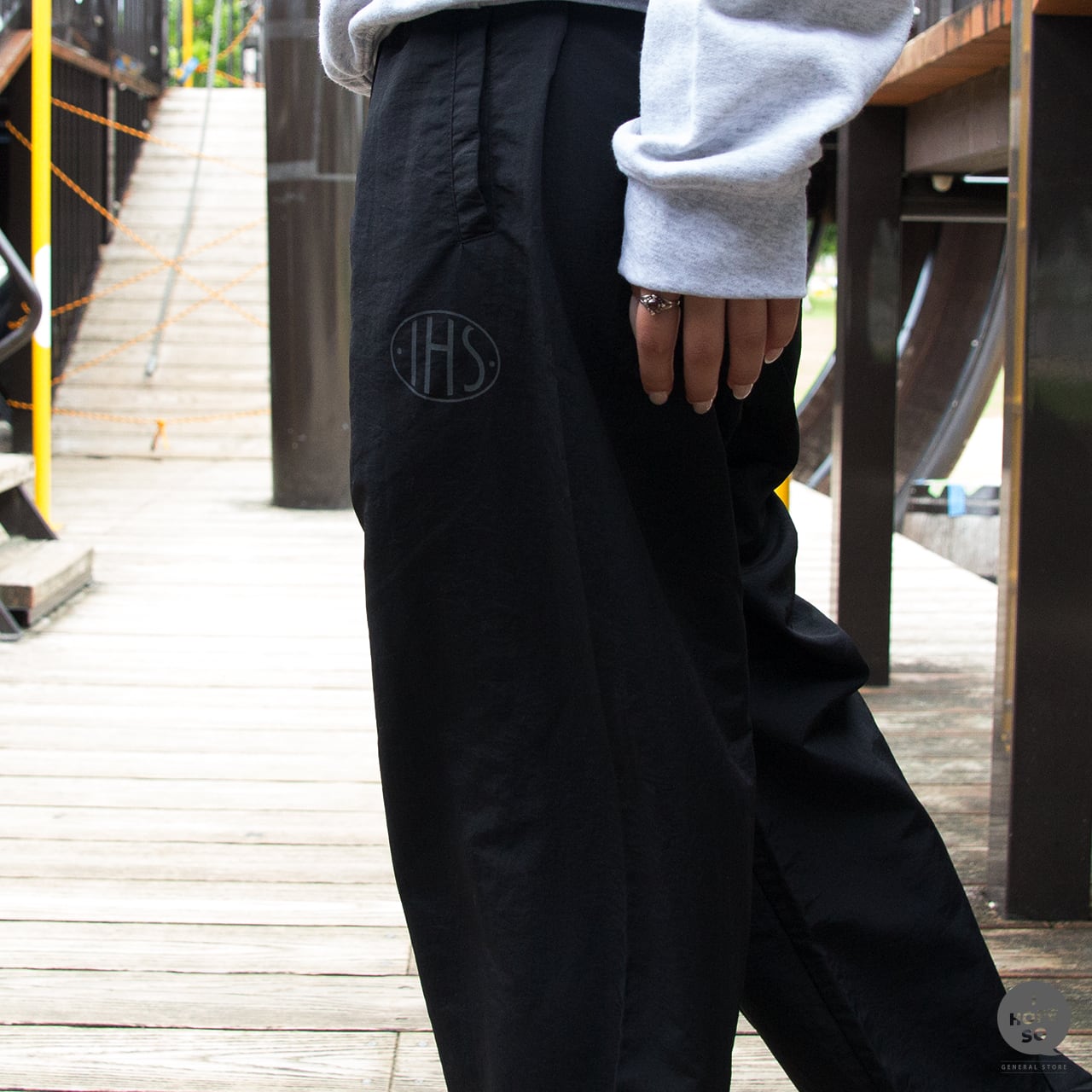 ※脇ポケットあり、ウエスト丸ひもあり(内側)、ヒップポケットあり(右側)、裾口シャーリング仕様