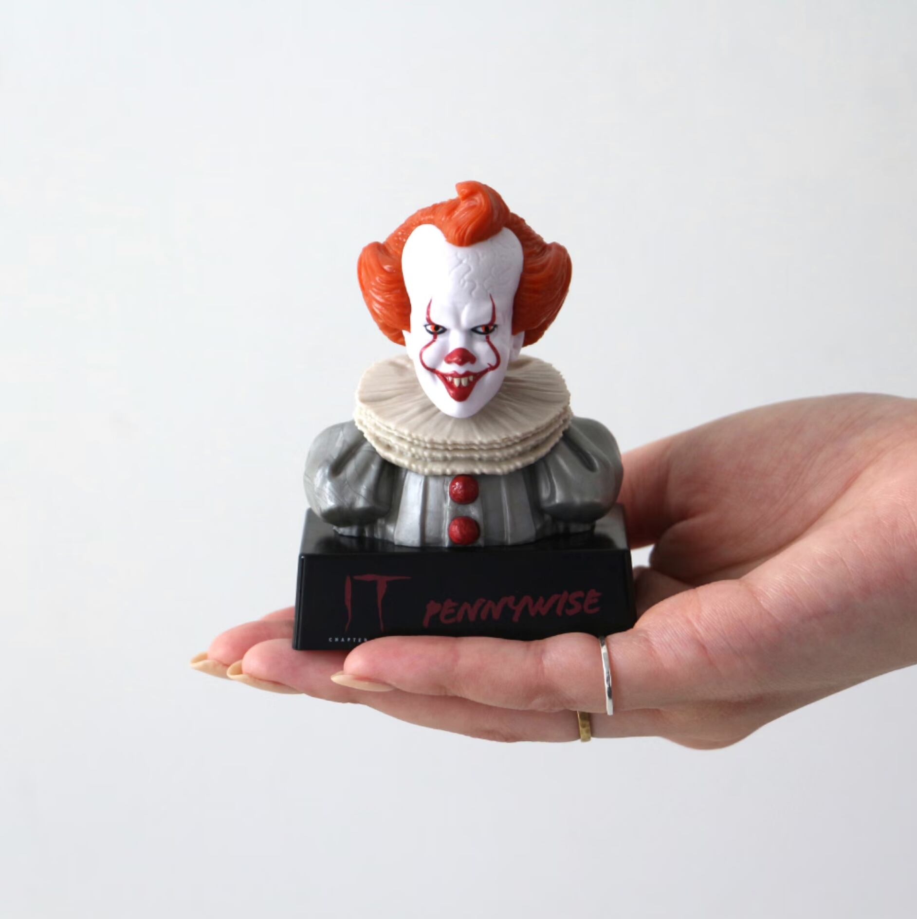 特徴的な表情や造形がリアルに再現され、コレクションや映画グッズとしても人気の高いアイテム。土台部分の背面にあるボタンを押すと、ペニーワイズの恐ろしい囁きが再生されます。