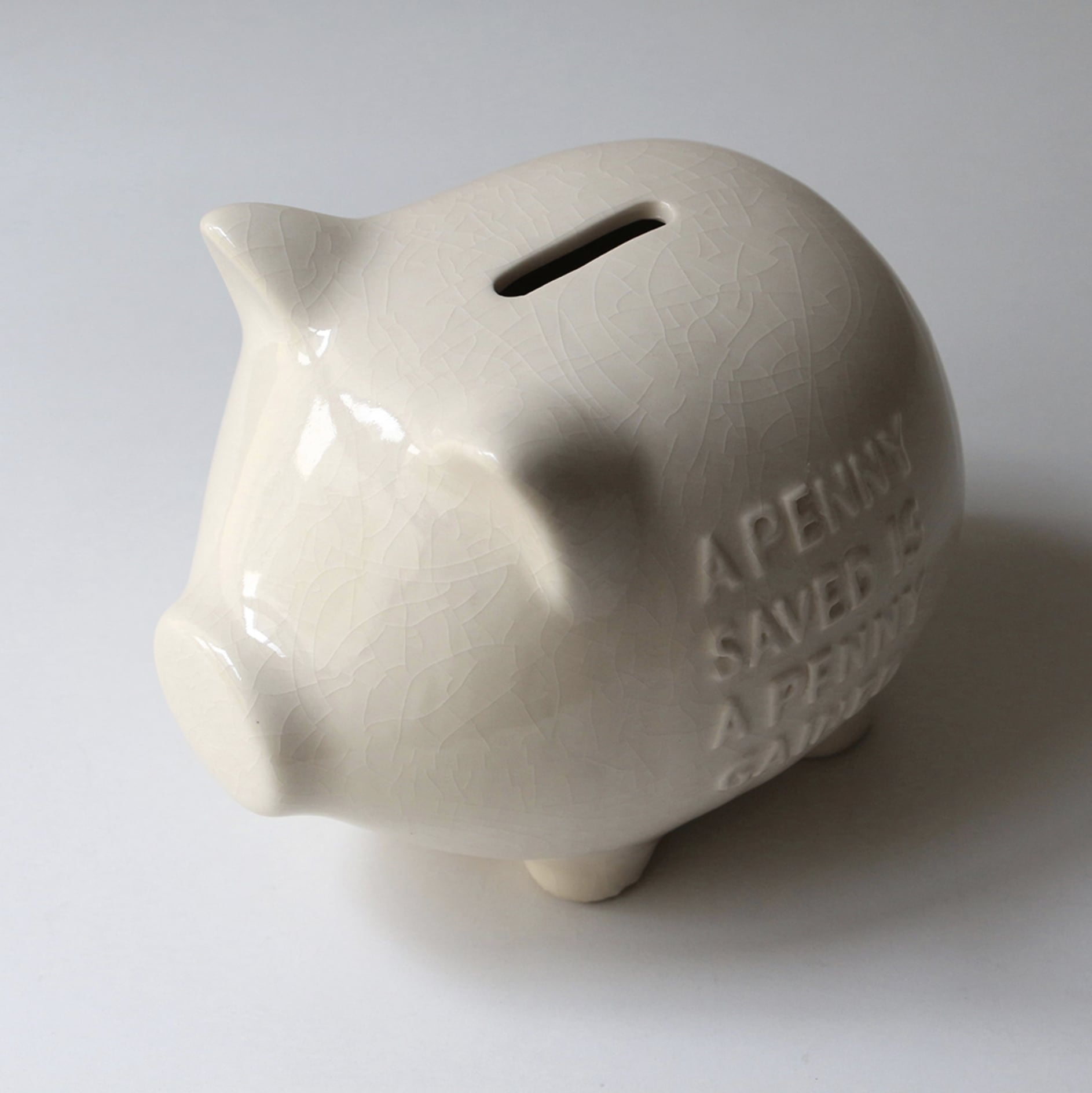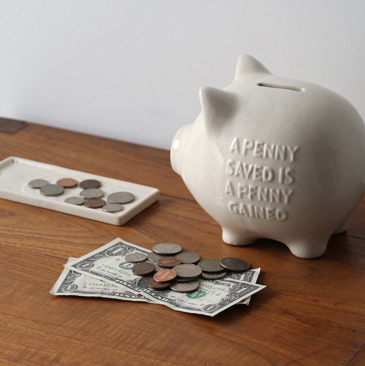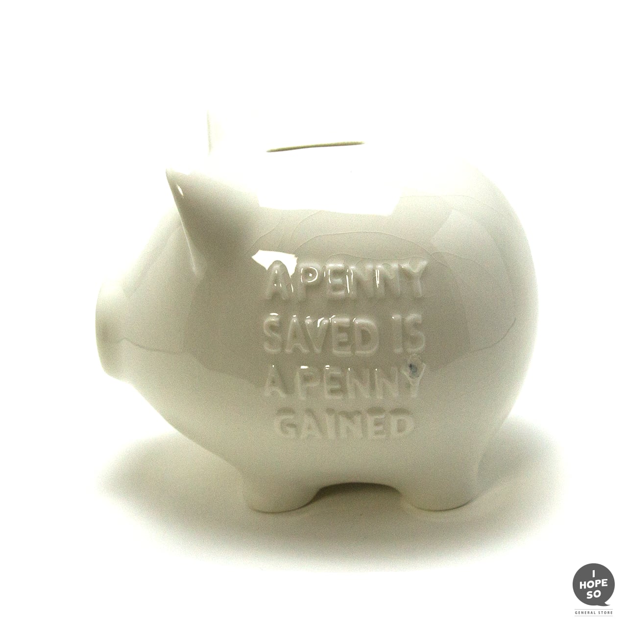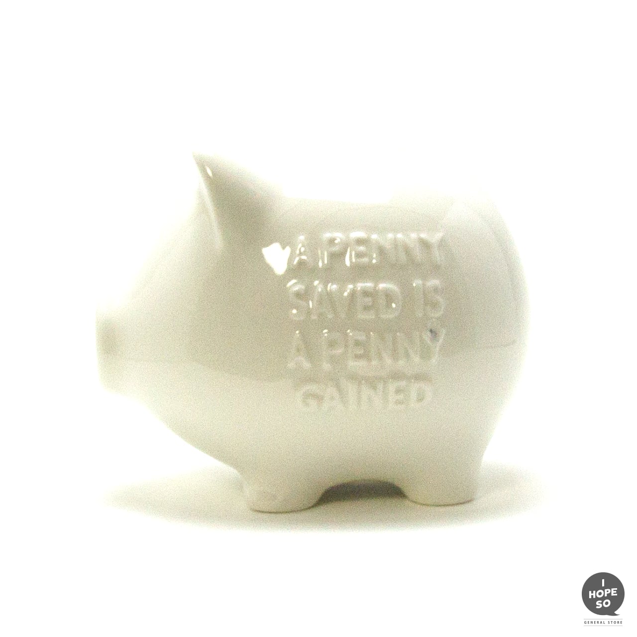 ボディにはベンジャミン・フランクリンの格言「A PENNY SAVED IS A PENNY GAINED」をエンボスで表現され、コインを落とすと陶器ならではの澄んだ音が響き、底面にはラバー蓋付きで使い勝手も良好。