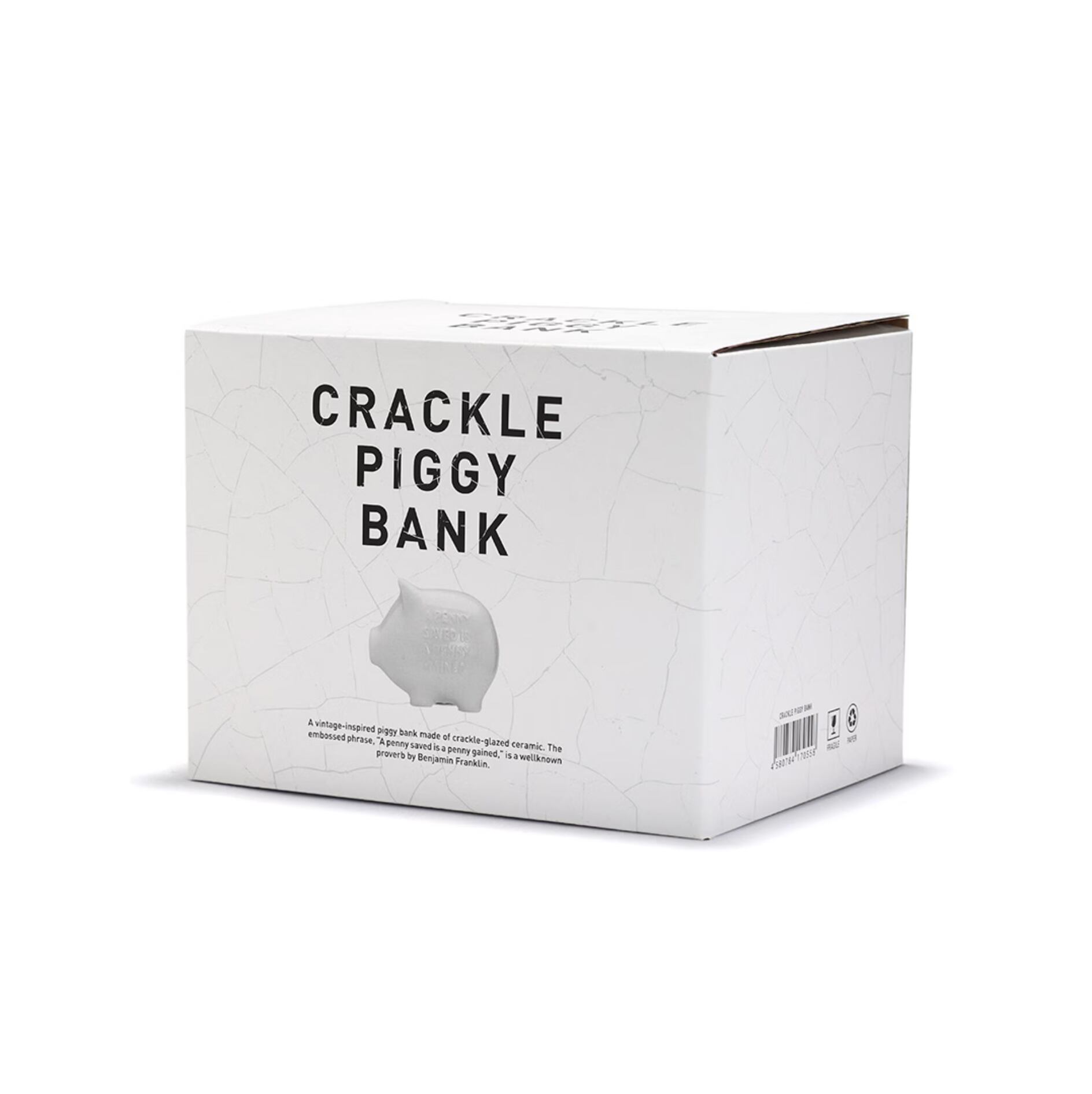1950〜60年代のコミックス調を思わせる、ぽってりとした丸いシルエットがどこか懐かしい佇まいのCrackle Piggy Bankになります。