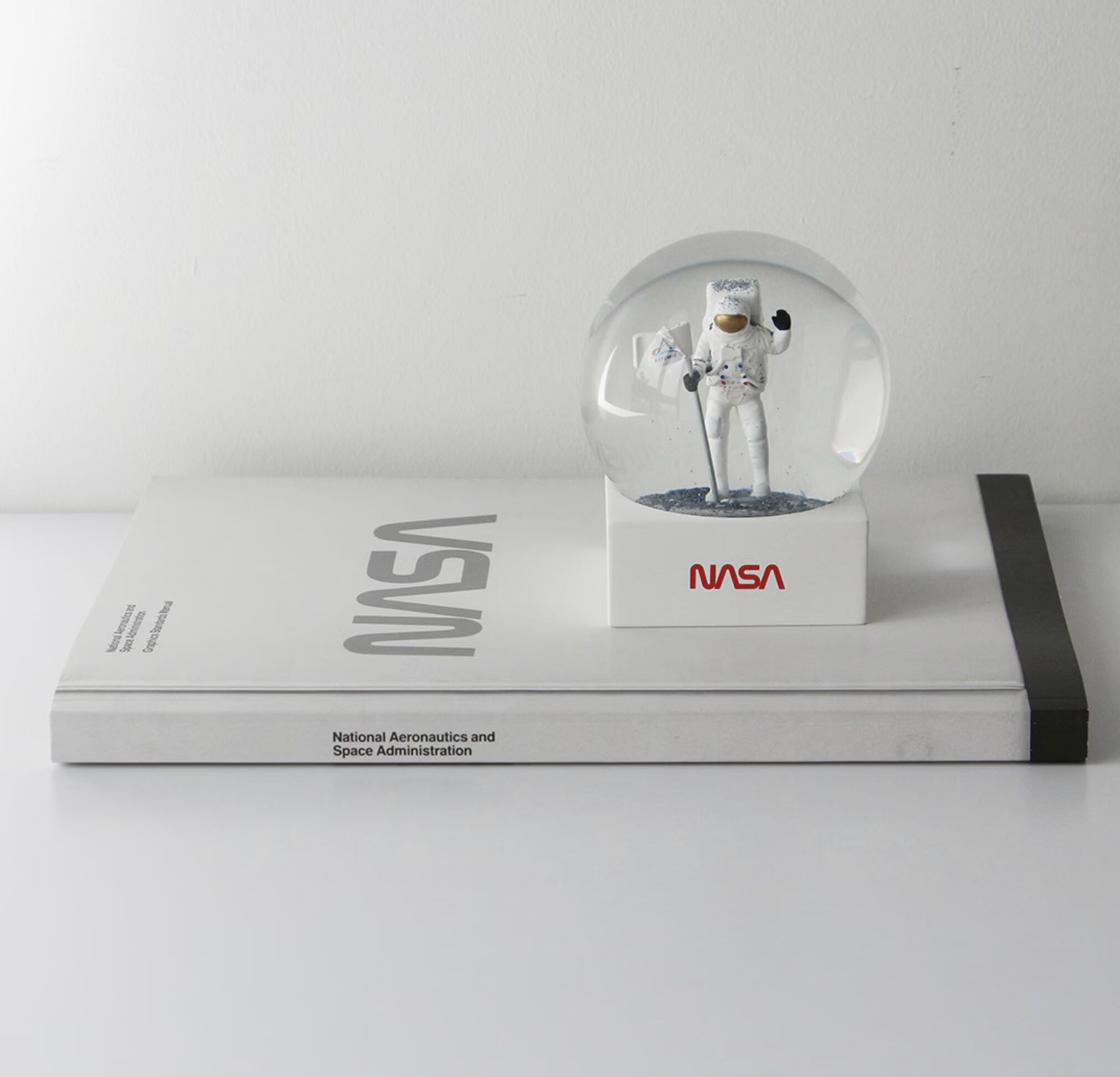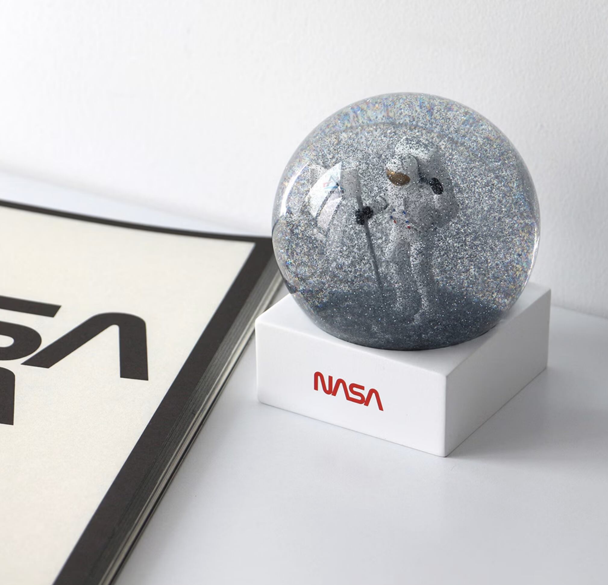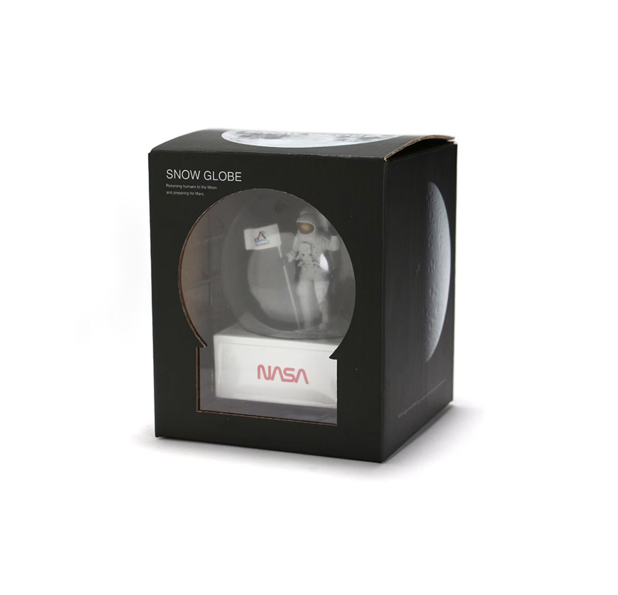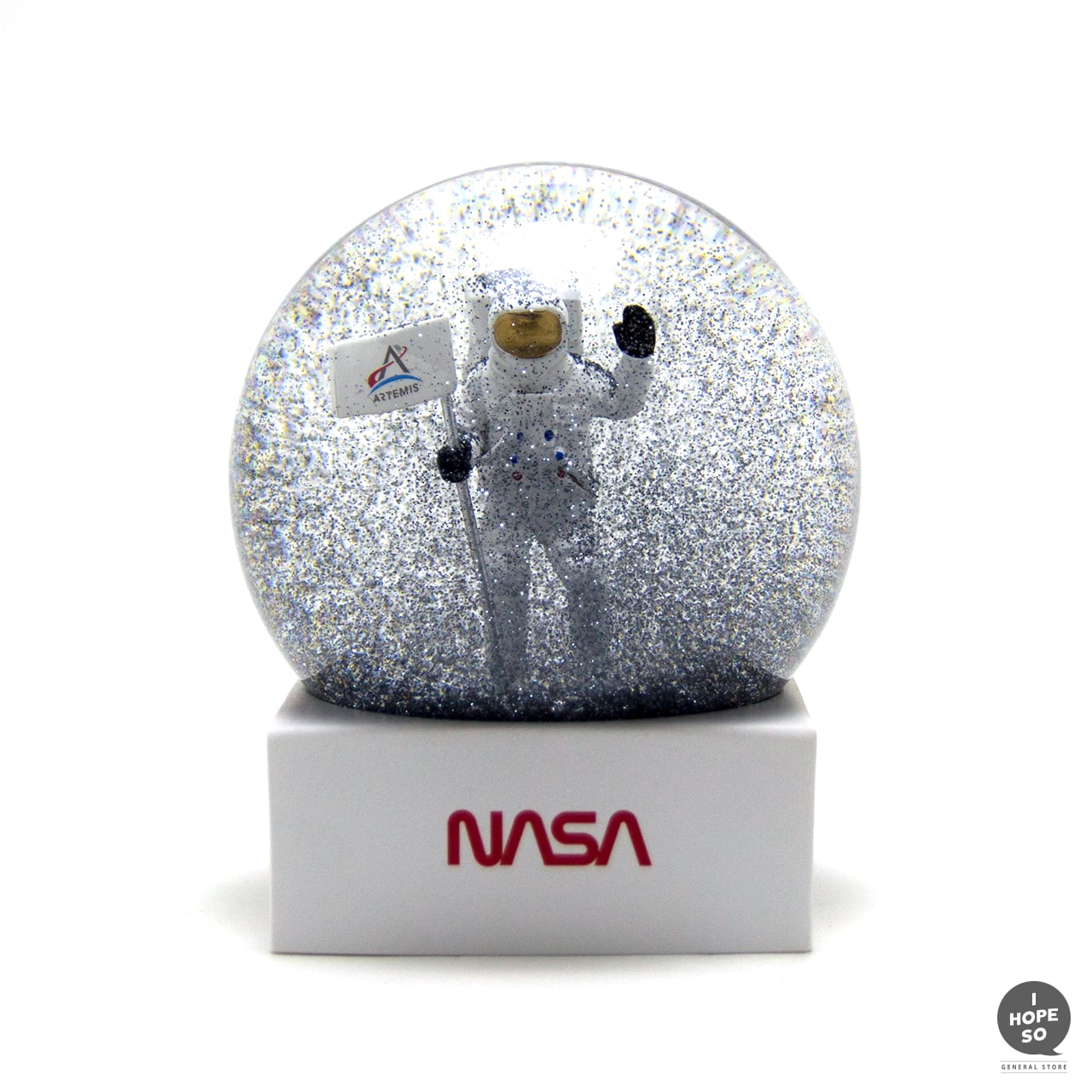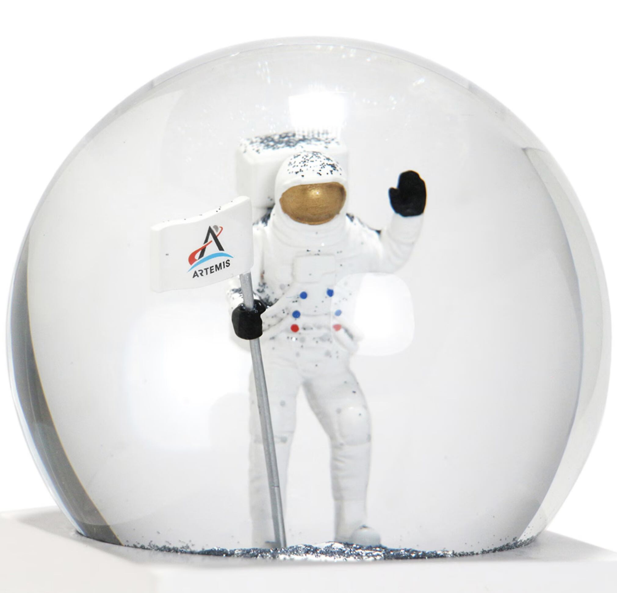 手に掲げた「ARTEMIS(アルテミス)」の旗が、次世代の月探査ミッションを象徴しており、ドームを揺らすと銀色の粒子が舞い、月面の砂埃のような幻想的な風景が広がります。