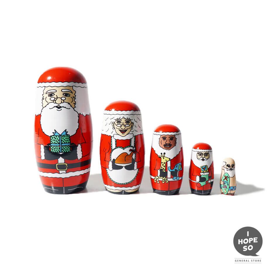 ヨーロッパ大陸、アメリカ大陸、アフリカ大陸、アジア大陸、オーストラリア大陸の5大陸のサンタをイメージしたマトリョーシカになります。