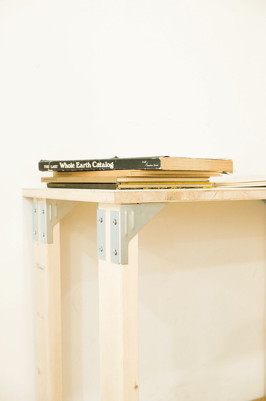 天板の裏の4隅に、このプロダクトを取り付け、同じ長さにカットした2x4材 4本をはめ込み、固定するだけで机を作成出来ます。PILLAR BRACKET、PILLAR BRACKET SHELVING STAYと組み合わせると、棚と机が一体化したものも作成可能となります。